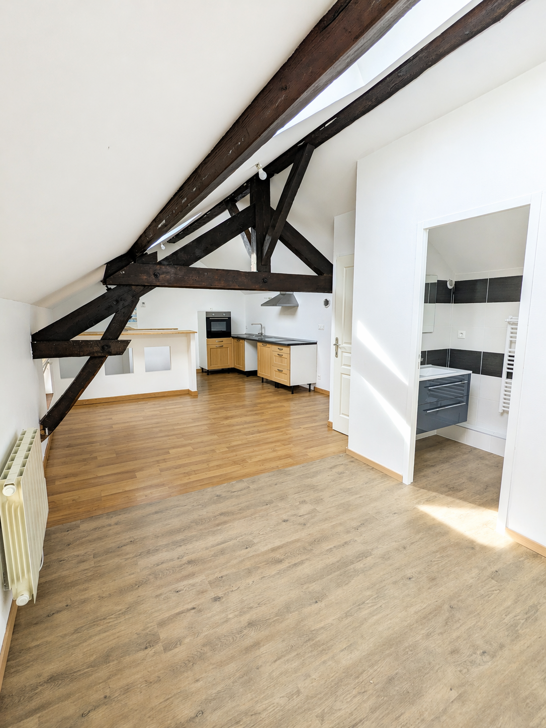 Polliat (01310)Votre agence Immobilière, ECLIPSE IMMOBILIER, votre propose à la location un appartement 3 pièces d'environ 40 m² surface Carrez, mais 50 m² au sol environ, au 2ème et dernier étage d'un petit immeuble au centre de Polliat.