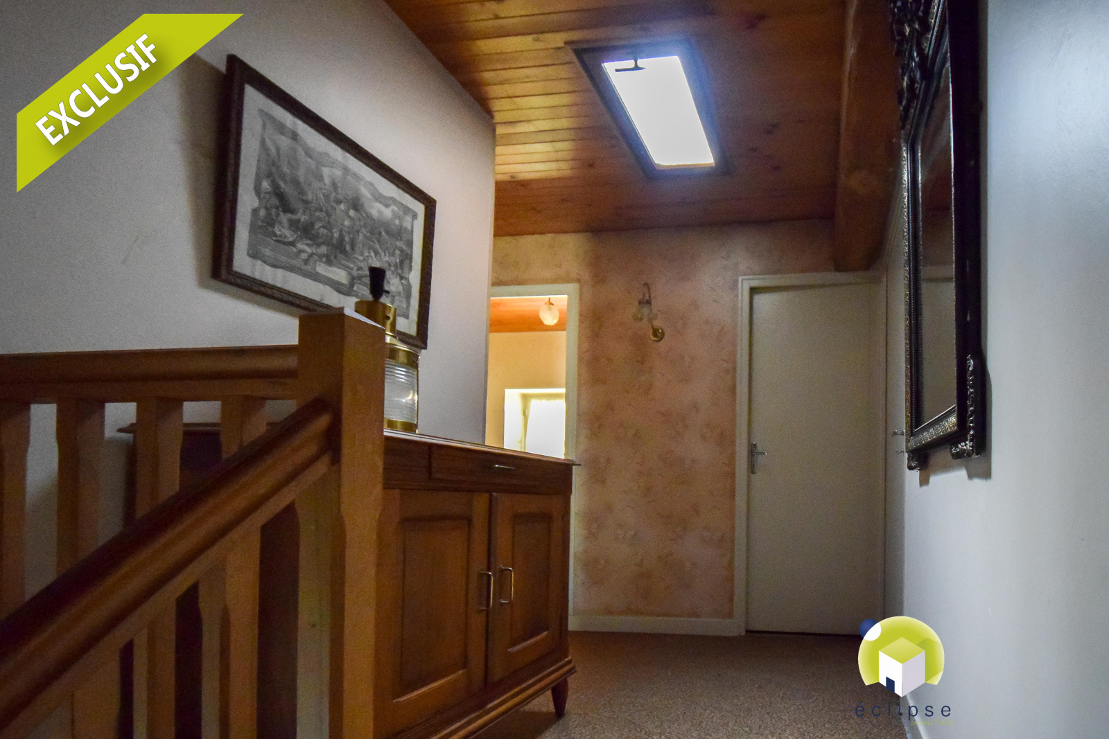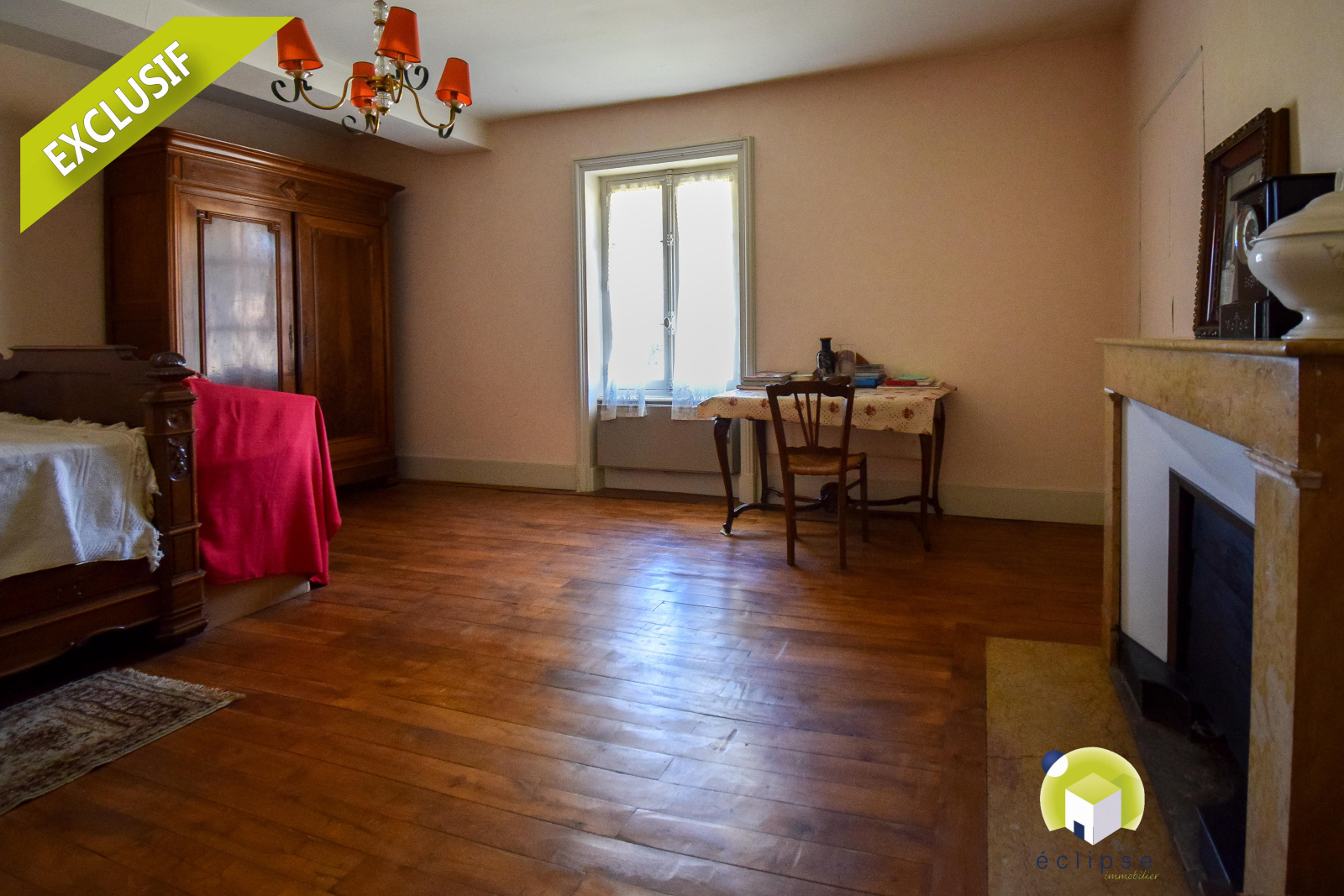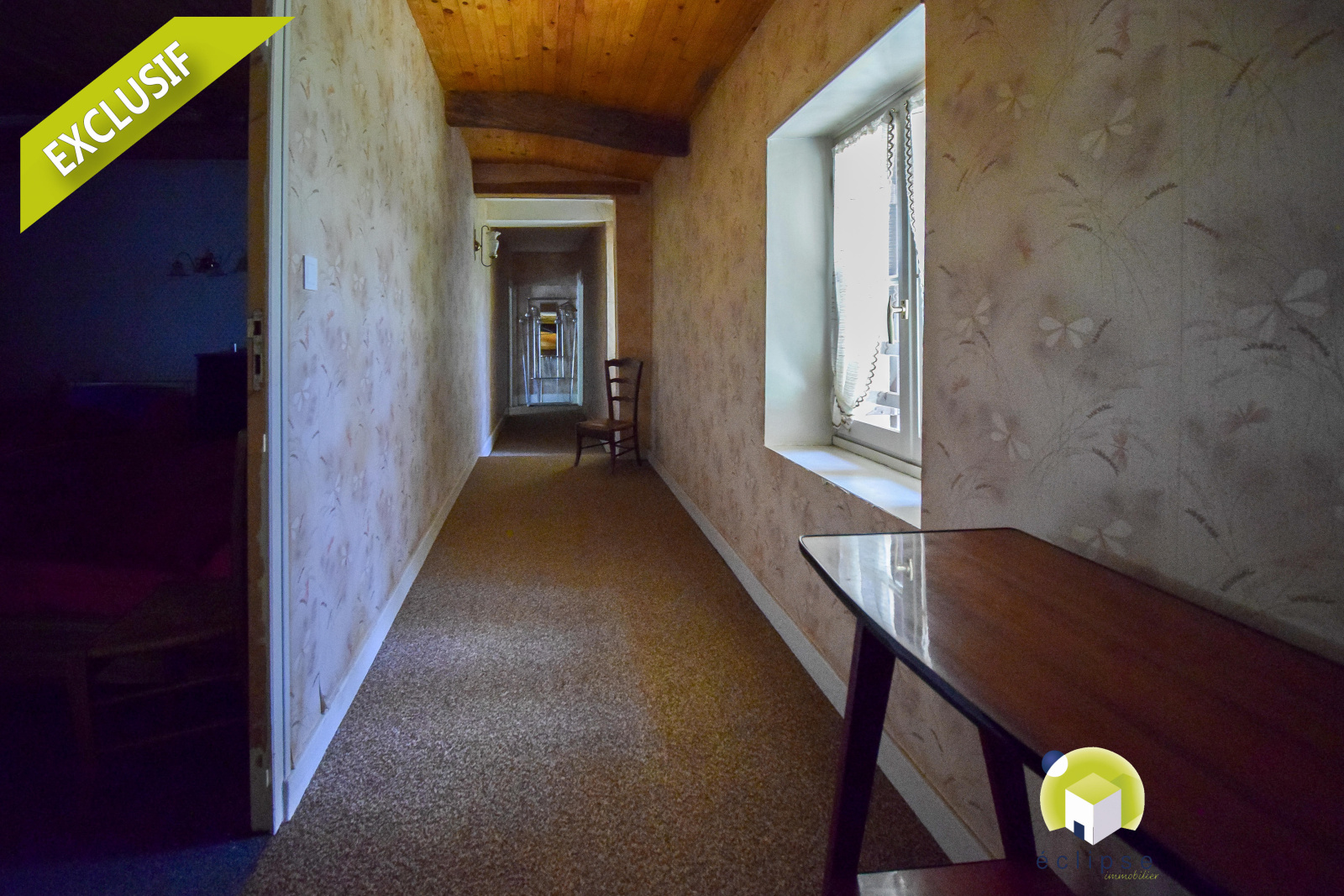 A l'étage : un pallier prolongé d'un couloir venant desservir trois grandes chambres ( avec possibilité d'une quatrième ) , une salle de bain, un toilettes, et un grenier.