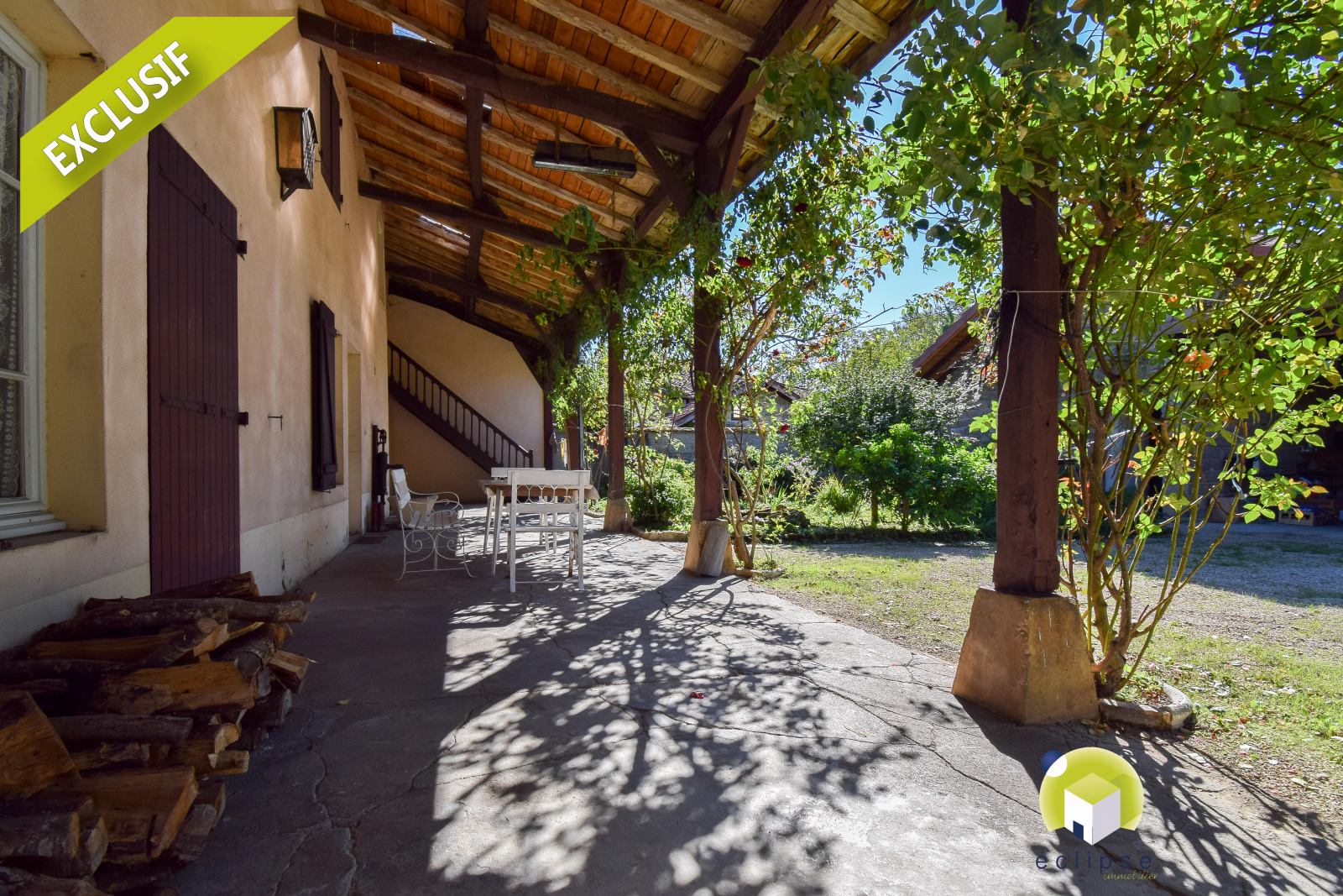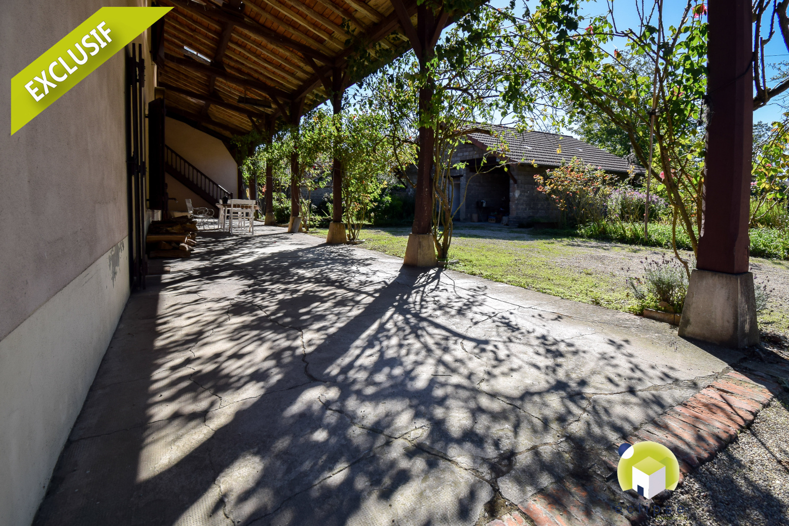 Le bien dispose également d'une grande terrasse couverte à l'Ouest, sur toute la longueur de la maison ... et d'une dépendance ( avec atelier, cave, remises et appentis ) avec un auvent attenant.