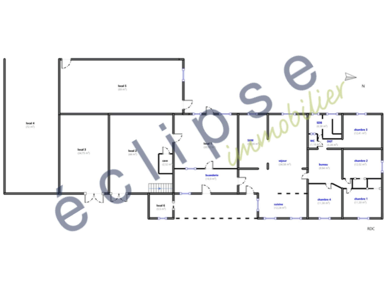 L'habitation, de plain pieds, comprend cuisine, séjour, salon, 4 chambres, salle d'eau et toilettes.