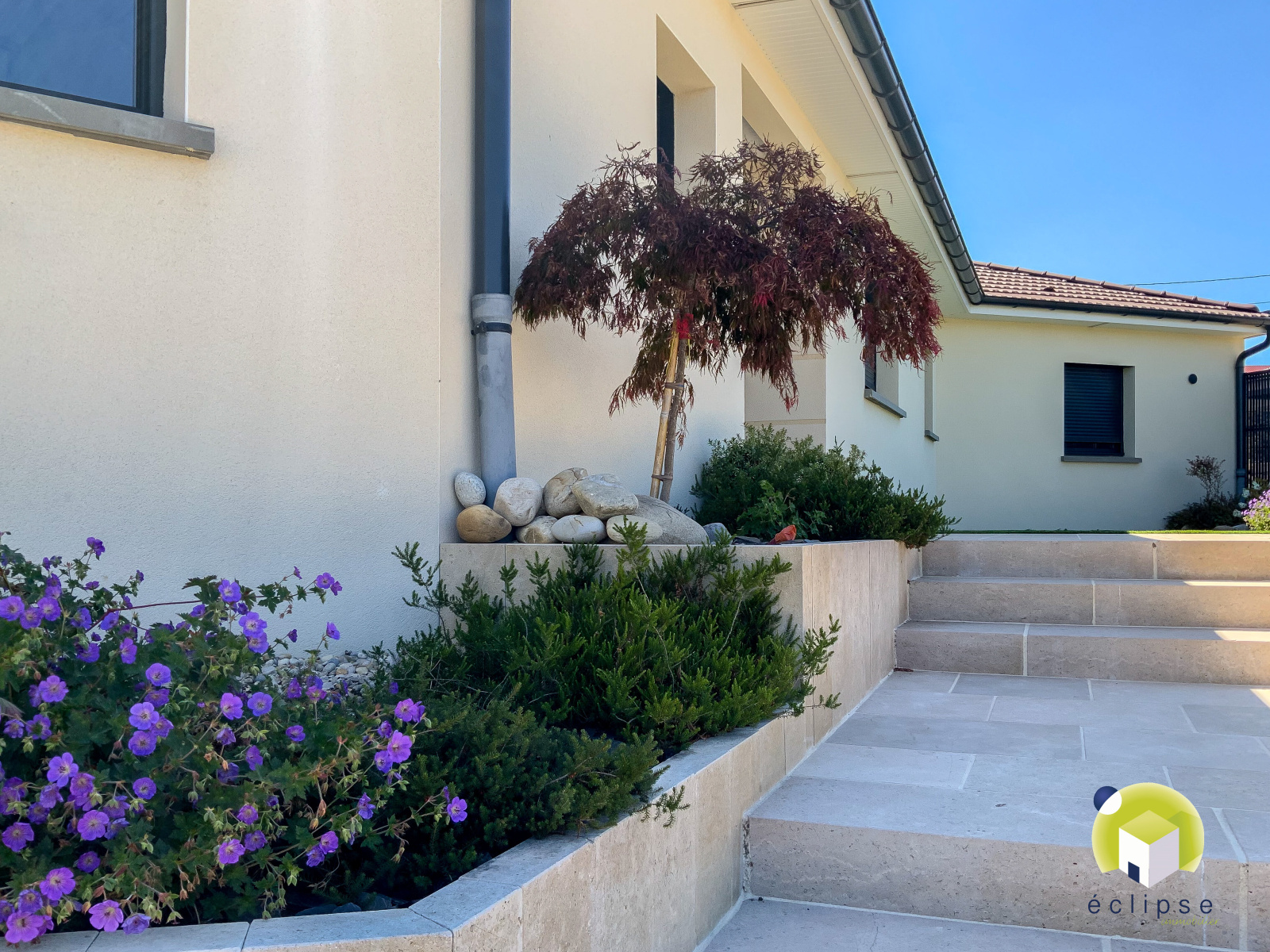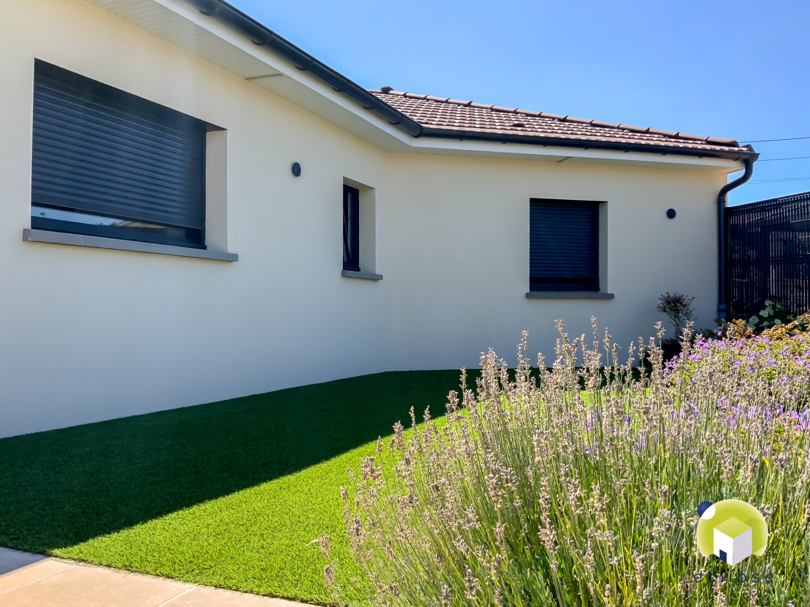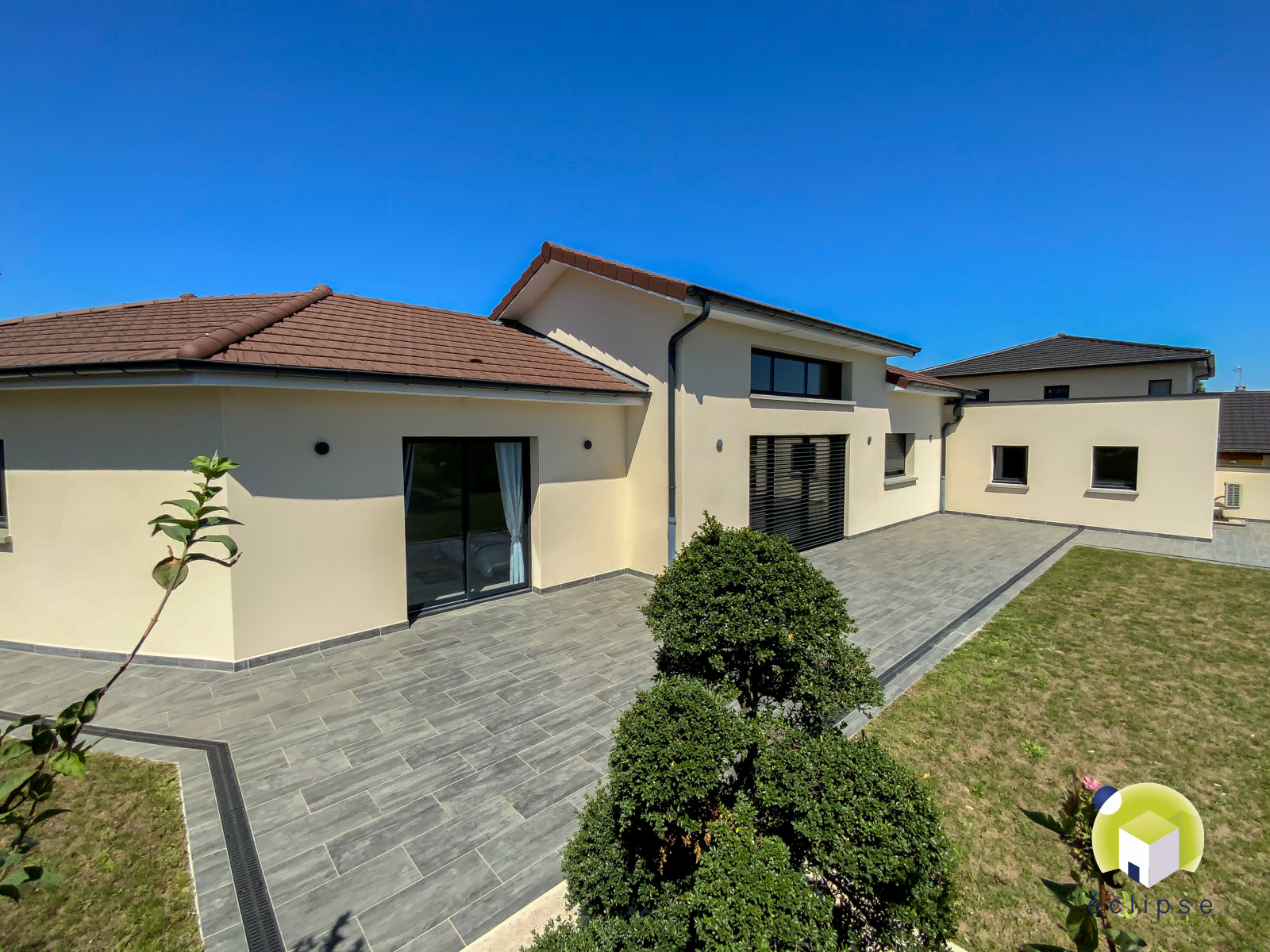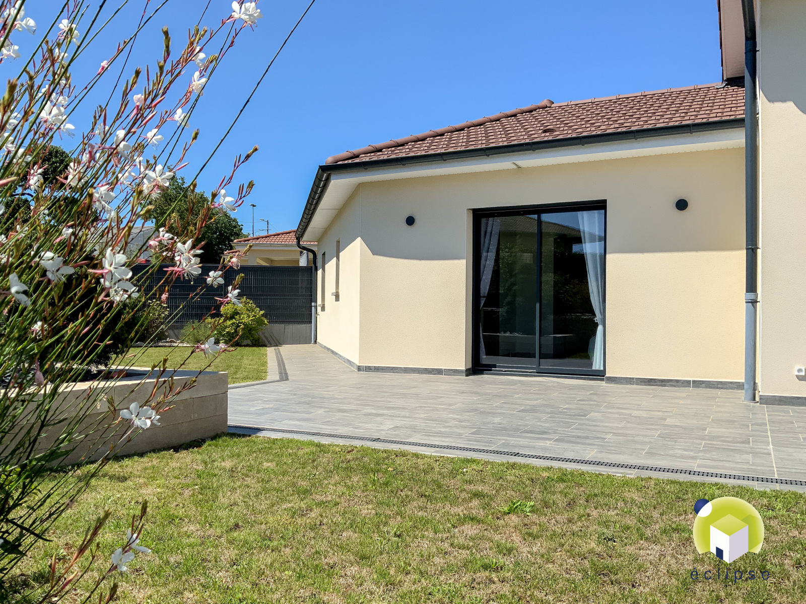 Sur la commune de VIRIAT, une belle villa contemporaine d' env. 137 m² habitables de plain pieds + garage double, sur un terrain d'env. 630 m² paysagé.