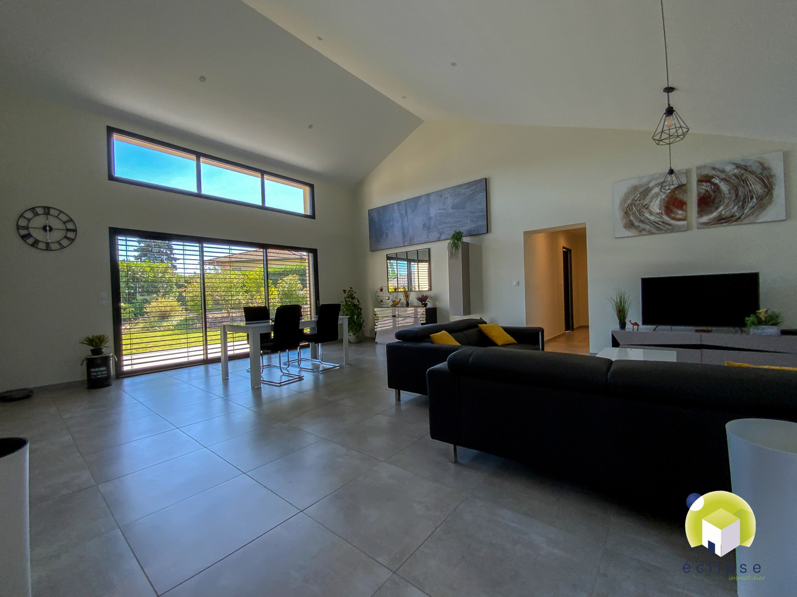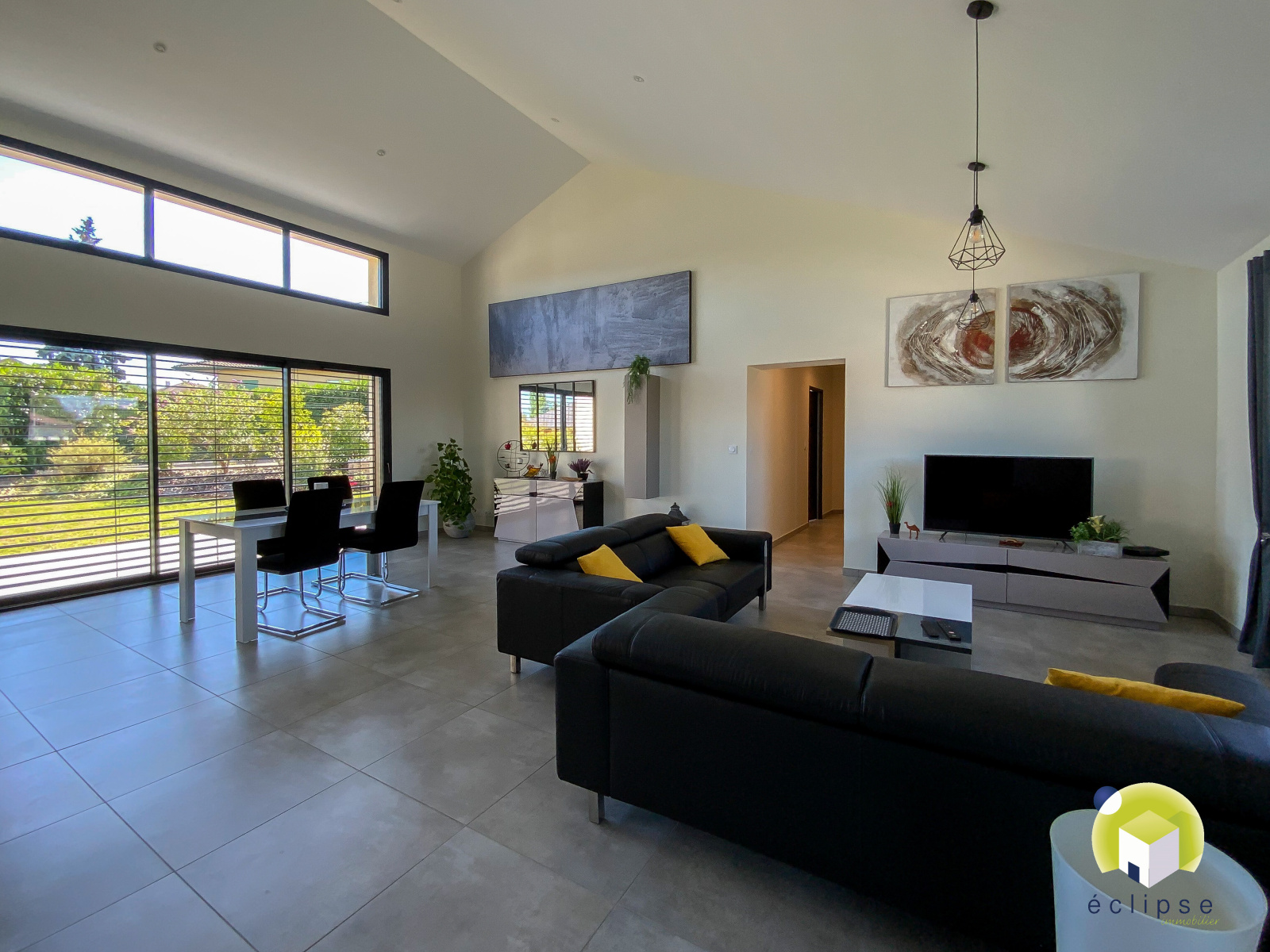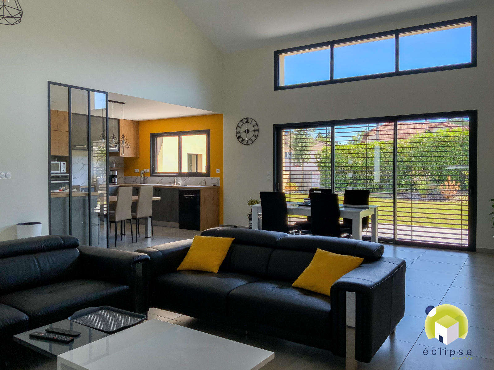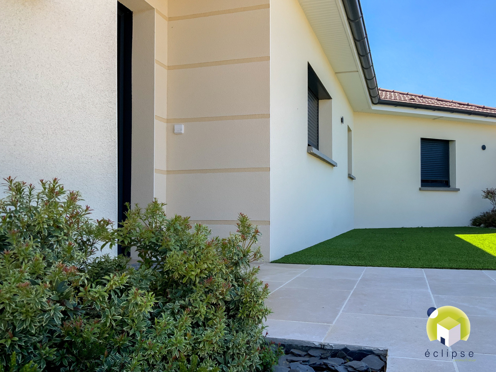 Sur la commune de VIRIAT, une belle villa contemporaine d' env. 137 m² habitables de plain pieds + garage double, sur un terrain d'env. 630 m² paysagé.